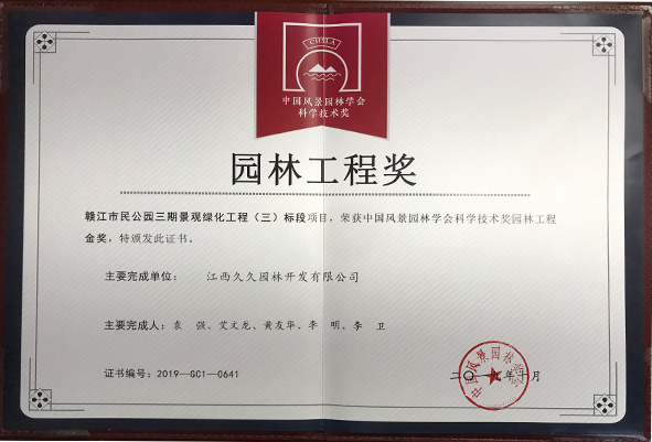 2019年中国风景园林学会工程分会年会于1月6日-8日在湖南长沙荣重举行。我司承建“赣江市民公园景观绿化工程(三)标段”荣获中国风景园林学会科学技术奖园林工程金奖。